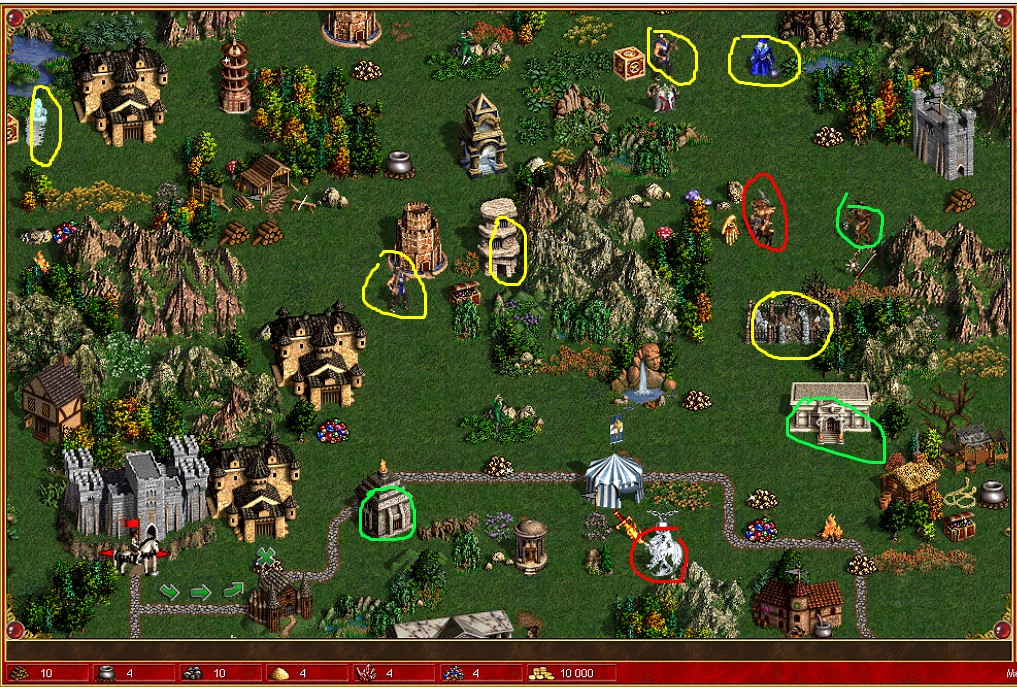 Green - easy, Yellow - medium, and Red - difficult guard. Depending on the difficulty, you will need a corresponding army size, hero stats, and magic.